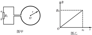 2、填空题 如图甲所示,一个电阻值为R的圆形金属线圈与阻值为2R的电阻R1连接成闭合回路.线圈的半径为r.在线圈中存在垂直于线圈平面向里的匀强磁场,磁感应强度B随时间t变化的关系如图乙所示,图中B0和t0已知.导线电阻不计.求:0至t0时间内,