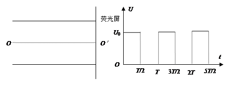 1、计算题 如图所示,两平行金属板相距为d,加上如图所示(b)所示的方波形电压,电压的最大值为U0,周期为T.现有重力可忽略的一束离子,每个离子的质量为m,电量为q,从与两板等距处的O点,沿着与板平行的方向连续地射入两板中。已知每个离子通过平行板所需的时间恰为T(电压变化周期)且所有离子都能通过两板间的空间,打在两金属板右端的荧光屏上,试求: