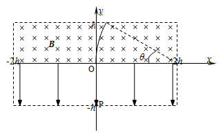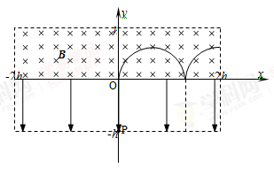 5、计算题  (16分)真空中有如图所示矩形区域,该区域总高度为2h、总宽度为4h,其中上半部分有磁感应强度为B、垂直纸面向里的水平匀强磁场,下半部分有竖直向下的匀强电场,x轴恰为水平分界线,正中心恰为坐标原点O。在x =" 2.5" h处有一与x轴垂直的足够大的光屏(图中未画出)。质量为m、电荷量为q的带负电粒子源源不断地从下边界中点P由静止开始经过匀强电场加速,通过坐标原点后射入匀强磁场中。粒子间的相互作用和粒子重力均不计。