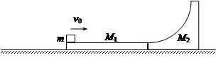 2、计算题 如图所示,两质量分别为M1=M2=1.0kg的木板和足够高的光滑凹槽静止放置在光滑水平面上,木板和光滑凹槽接触但不粘连,凹槽左端与木板等高。现有一质量m=2.0kg的物块以初速度vo=5.0m/s从木板左端滑上,物块离开木板时木板的速度大小为1.0m/s,物块以某一速度滑上凹槽。已知物块和木板间的动摩擦因数μ=0.5,重力加速度g取10m/s2。求: