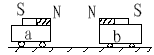 4、填空题 如图所示,两相同的磁铁分别固定在两相同的小车上,水平面光滑,开始两车相向运动,va=3m/s,vb=2m/s,设相互作用时两车不会相碰,则当b车速度为零时,va =_____________,方向_____________;当两车相距最近时,vb=_____________,方向_____________。