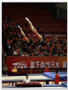 4、计算题 蹦床是运动员在一张绷紧的弹性网上蹦跳、翻滚并做各种空中动作的运动项目(如图所示)。一个质量为60kg的运动员,从离水平网面3.2m高处自由下落,着网后沿竖直方向蹦回到离水平网面5.0m高处。已知运动员与网接触的时间为1.2s。若把在这段时间内网对运动员的作用力当作恒力处理,求此力的大小。(g=10m/s2)