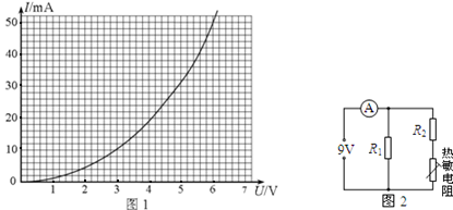 3、实验题 图1为某一热敏电阻的I-U关系曲线图,在图2所示的电路中,电源电压恒为9v,电流表读数为70mA,定值电阻R1=250,由热敏电阻的I-U关系曲线可知,热敏电阻两端的电压约为 v,热敏电阻的阻值约为