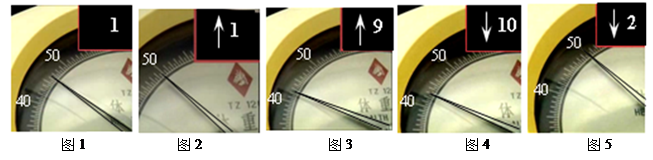 4、选择题  几位同学为了探究电梯运动时的加速度大小,他们将体重计放在电梯中.电梯起动前,一位同学站在体重计上,如图1所示.然后电梯由1层直接升到10层,之后又从10层直接回到1层.图2至图5是电梯运动过程中按运动顺序在不同位置体重计的示数.根据记录,进行推断分析,其中正确的是(? )