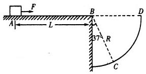 2、计算题 (10分)如图所示,水平地面的B点右侧有一圆形挡板。圆的半径R=4m,B为圆心,BC连线与竖直方向夹角为37o.滑块静止在水平地面上的A点,AB间距L=4.5m.现用水平拉力F=18N沿AB方向拉滑块,持续作用一段距离后撤去,滑块恰好落在圆形挡板的C点,已知滑块质量辨=2kg,与水平面间的动摩擦因数=0.4,取g=10m/s2,sin37 o =0.6,cos37 o=0.8.求: