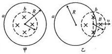 4、选择题 如图所示,a是半径为R的单匝圆形导线圈,b是半径为r的磁场区域,a、b共面,磁场方向垂直于圆面.甲中磁感应强度随时间变化,