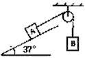 4、计算题 如图所示,物体A质量为2kg,与斜面间摩擦因数为0.4。若要使A在斜面上静止,物体B质量的最大值和最小值是多少?