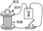 4、选择题 如图所示,线圈与电源、开关相连,直立在水平桌面上。铁芯插在线圈中,质量较小铝环套