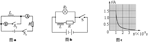 (2)如图b所示是甲同学研究自感现象的实验电路图,并用电流传感器显示出在t=1×10-3s时断开开关前后一段时间内各时刻通过线圈L的电流(如图c).已知电源电动势E=9V,内阻不计,灯泡R1的阻值为9Ω,电阻R的阻值为2Ω.