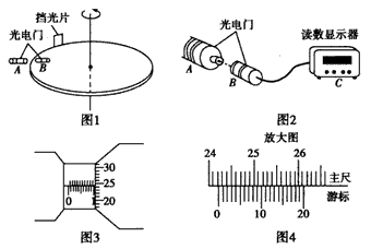 1、实验题 一水平放置的圆盘绕过其圆心的竖直轴匀速转动,盘边缘上固定一竖直的挡光片,盘转动时挡光片从一光电数字计时器的光电门的狭缝中经过,如图1所示。图2为光电数字计时器的示意图。光源A中射出的光可照到B中的接收器上,若A、B间的光路被遮断,显示器C上可显示出光线被遮住的时间。挡光片的宽度用螺旋测微器测得,结果如图3所示,圆盘直径用游标卡尺测得,结果如图4所示。由图可知