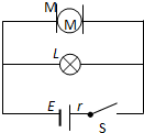 4、计算题 (8分)如图所示,电源电动势E=10V,内阻r=0.5Ω;开关闭合后“8V、 12W”的灯泡恰好能正常发光,电动机也正常工作,电动机M绕组的电阻R0=1Ω,求:
