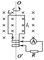 4、计算题 如图所示,一矩形线圈在匀强磁场中绕OO′轴匀速转动,磁场方向与转轴垂直.线圈匝数n=40,电阻r=0.1 Ω,长l1=0.05 m,宽l2=0.04 m,角速度ω=100 rad/s,磁场的磁感应强度B=0.2 T.线圈两端外接电阻R=9.9 Ω的用电器和一个交流电流表.求: