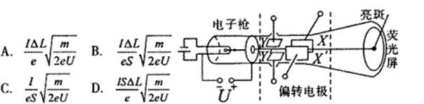 4、选择题  示波管是一种多功能电学仪器,其结构图如下图所示,电子枪中的炽热金属丝不断放出可认为初速度为零的电子,在加速电场加速,再经偏转电极xx’和YY′,最后在荧光屏上形成图象。现在偏转电极xx′和YY′上不加电压,加速电场电压为U,经加速后形成横截面积为S、电流为I的电子束。已知电子的电量为e、质量为m,则在刚射出加速电场时,一小段长为△L的电子束内电子个数是