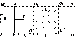 4、计算题 如图,光滑平行的水平金属导轨MN、PQ相距l,在M点和P点间接一个阻值为R的电阻,在两导轨间OO1O1′O′矩形区域内有垂直导轨平面竖直向下、宽为d的?匀强磁场,磁感强度为B。一质量为m,电阻为r的导体棒ab,垂直搁在导轨上,与磁场左边界相距l0。现用一大小为F、水平向右的恒力拉ab棒,使它由静止开始运动,棒ab在离开磁场前已经做匀速直线运动(棒ab与导轨始终保持良好的接触,导轨电阻不计)。求: