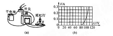 5、简答题 利用气体自激导电发光的霓虹灯,加上80 V以上的电压才会点亮.利用图(a)所示电路,可以在短时间内点亮霓虹灯.已知干电池电动势6 V,内阻5Ω,线圈电阻35Ω,电路中线圈以外回路的电感可忽略不计.先开关闭合,经过一段时间,回路中电流为一定值;再断开开关,霓虹灯短时间内点亮,其