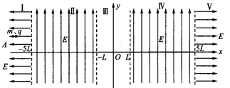 3、计算题 如图所示,在Oxy平面内存在I、Ⅱ、Ⅲ、Ⅳ、Ⅴ五个特殊的电场区域,即在x≤-5L区域I和x≥5L区域Ⅴ存在两个场强大小均为E的匀强电场,方向分别为水平向左和水平向右,在-5L<x≤-L区域Ⅱ和5L>x≥L区域 Ⅳ存在两个场强大小均为E、方向竖直向上的匀强电场,在