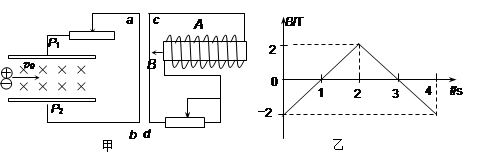 5、选择题 等离子气流由左方连续以v0射入Pl和P2两板间的匀强磁场中,ab直导线与Pl、P2相连接,线圈A与直导线cd连接。线圈A 内有随图乙所示的变化磁场。且磁场B 的正方向规定为向左,如图甲所示,则下列叙述正确的是