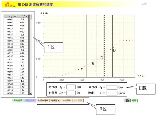 3、实验题 如图是利用DIS实验系统进行“研究变速直线运动的位移与速度”实验时所获取的电脑屏幕截图,图中用细实线框出了三个区域,根据图上显示的实验信息可知,(从给出的选项中选择:A 选择实验数据处理方式、B 记录所采集的实验数据、? C 提取实验数据? D 操控实验数据采集)