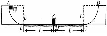 的光滑1/4圆弧面,中间长为2L的粗糙水平面.质量为3m的滑块乙开始停在水平面的中点O处,质量为m的滑块甲从光滑圆弧面顶端A处无初速度滑下,进入水平面内与乙发生碰撞,碰后甲以碰前一半的速度反弹.已知甲、乙与水平面的动摩擦因数分别为μ1=0.2、μ2=0.1,甲、乙的体积大小忽略不计.g=10 m/s2.求: