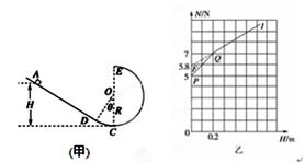 3、计算题 如图甲所示,一竖直平面内的轨道由粗糙斜面AD和光滑圆轨道DCE组成,AD与DCE相切于D点,C为圆轨道的最低点,将一小物块置于轨道ADC上离地面高为H处由静止释放,用力传感器测出其经过C点时对轨道的压力N,改变H的大小,可测出相应的N的大小,N随H的变化关系如图乙折线PQI所示(PQ与QI两直线相连接于Q点),QI反向延长交纵轴于F点(0,5.8N),重力加速度g取10m/s2,求: