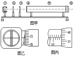 (2)已知双缝到光屏之间的距离是600mm,双缝之间的距离是0.20mm,单缝到双缝之间的距离是100mm,某同学在用测量头测量时,先将测量头目镜中看到的分划板中心刻线对准某条亮纹(记作第1条)的中心,这时手轮上的示数如图乙所示.然后他转动测量头,使分划板中心刻线对准第8条亮纹的中心,这时手轮上的示数如图丙所示,则图乙示数为________mm,条纹间距为________mm.