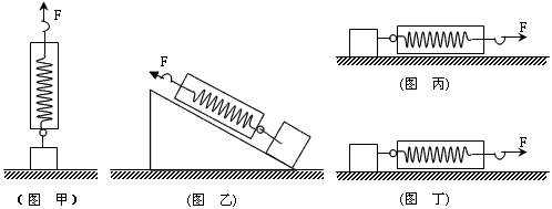 5、选择题 四个完全相同的弹簧秤,外壳通过绳子分别与四个完全相同的物体相连,挂钩一端施加沿轴线方向的恒力F,以下四种情况中关于弹簧秤读数的说法正确的是