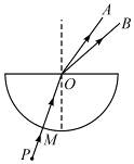 5、选择题 如图4-1-9所示,一半圆形玻璃砖,O为圆心,从线光源P处发出包括红、紫两种颜色的复色光,沿PM方向射向玻璃砖,在O点经过折射后,出射光分别为OA、OB,则下列说法正确的是(?)