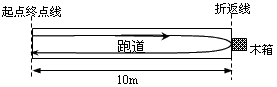 2、计算题 “10米折返跑”的成绩反应了人体的灵敏素质。测定时,在平直跑道上,受试者以站立式起跑姿势站在起点终点线前,当听到“跑”的口令后,全力跑向正前方10米处的折返线,测试员同时开始计时。受试者到达折返线处时,用手触摸折返线处的物体(如木箱),再转身跑向起点终点线,当胸部到达起点终点线的垂直面时,测试员停表,所用时间即为“10米折返跑”的成绩。设受试者起跑的加速度为4m/s2,运动过程中的最大速度为4m/s,快到达折返线处时需减速到零,加速度的大小为8m/s2,返回时达到最大速度后不需减速,保持最大速度冲线。受试者在加速和减速阶段运动均可视为匀变速直线运动。问该受试者“10米折返跑”的成绩为多少秒?