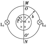 4、计算题 半径为a的圆形区域内有均匀磁场,磁感应强度为B=0.2 T,磁场方向垂直纸面向里,半径为b的金属圆环与磁场同心放置,磁场与环面垂直,其中a=0.4 m,b=0.6 m,金属圆环上分别接有灯L1、L2,两灯的电阻均为R0=2 Ω,一金属棒MN与金属圆环接触良好,棒与环的电阻均忽略不计.