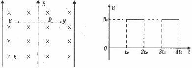 2、简答题 在地面附近的真空中,存在着竖直向上的匀强电场和垂直电场方向水平向里的匀强磁场,如图甲所示。磁场随时间变化情况如图乙所示.该区域中有一条水平直线MN,D是MN上的一点.在t=O时刻,有一个质量为m、电荷量为+q的小球(可看作质点),从M点开始沿着水平直线以速度做匀速直线运动,