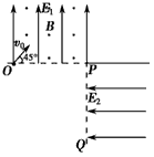 4、计算题 如图所示,竖直平面内有相互垂直的匀强电场和匀强磁场,电场强度E1=2 500 N/C,方向竖直向上;磁感应强度B=103 T,方向垂直纸面向外;有一质量m=1×10-2 kg、电荷量q=4×10-5 C的带正电小球自O点沿与水平线成45°角以v0=4 m/s的速度射入复合场中,之后小球恰好从P点进入电场强度E2=2 500 N/C,方向水平向左的第二个匀强电场中。不计空气阻力,g取10 m/s2。求: