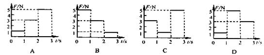 5、选择题 将质量为m=lkg的物体静止放在水平面上,物体与水平面之间的动摩擦因数为μ=0.2.现对物体施加一个方向不变的水平力F,其大小变化如下图所示,在3秒之内物体位移最大的力的图是(?)