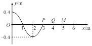2、选择题 P、Q、M是某弹性绳上的三个质点,沿绳建立x坐标轴。一简谐横波正在沿x轴的正方向传播,振源的周期为0.4s。在t=0时刻的波形如图所示,则在t=0.2s时