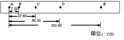 1、填空题 在研究匀变速直线运动的实验中,如图所示为一次记录小车运动情况的纸带,图中A、B、C、D、E为相邻的记数点,相邻记数点间有4个计时点未标出,设A点为计时起点