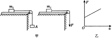 3、实验题 贝贝和晶晶在探究加速度与力、质量的关系的过程中分别采用了以下方案:两人都在水平桌面上放上一端带有定滑轮的长木板,在将相同质量的滑块放在木板上后,贝贝在滑块上用绳子连接重物A;晶晶则直接在滑块上施加竖直向下的拉力F。重物A的重力和拉力F大小相同,如图甲所示。不计滑块与长木板间的摩擦,也不计绳的质量及绳与滑轮间的摩擦,若m1运动的加速度为a1,m2运动的加速度为a2,那么: