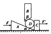 4、计算题 (8分)有一种机械装置叫做“滚珠式力放大器”,其原理如图所示,斜面A可以在水平面上滑动,斜面B以及物块C都是被固定的,它们均由钢材制成,钢珠D置于ABC之间.当用水平力F推斜面A时,钢珠D对物块C的挤压力F/就会大于F,故称为“滚珠式力放大器”.如果斜面A、B的倾角分别为α、β,不计一切摩擦力以及钢珠自身的重力,求: