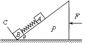 5、选择题 如图所示,在倾角为θ的光滑斜劈P的斜面上有两个用轻质弹簧相连的物块A、B,C为一垂直固定在斜面上的挡板。A、B质量均为m,斜面连同挡板的质量为M,弹簧的劲度系数为k,系统静止于光滑水平面。现开始用一水平恒力F作用于P,(重力加速度为g)下列说法中正确的是