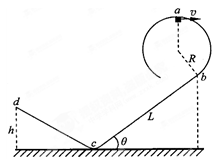 5、计算题 (16分)光滑圆轨道和两倾斜直轨道组成如图所示装置,其中直轨道bc粗糙,直轨道cd光滑,两轨道相接处为一很小的圆弧。质量为m=0.1kg的滑块(可视为质点)在圆轨道上做圆周运动,到达轨道最高点a时的速度大小为v=4m/s,当滑块运动到圆轨道与直轨道bc的相切处b时,脱离圆轨道开始沿倾斜直轨道bc滑行,到达轨道cd上的d点时速度为零。若滑块变换轨道瞬间的能量损失可忽略不计,已知圆轨道的半径为R=0.25m,直轨道bc的倾角θ=37o,其长度为L=26.25m,d点与水平地面间的高度差为h=0.2m,取重力加速度g=10m/s2,sin37°=0.6。求: