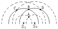5、填空题 如图所示,两个相干波源发出的两列波分别用不同的同心圆表示,波峰用实线表示,波谷用虚线表示。某一时刻两列波在介质中传播的情况如右图所示,则在介质中的A、B、C、D四点中,振动加强的点是_______________,振动减弱的点是_________________。