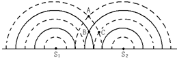 3、选择题 如图所示,S1和S2是两个完全相同的振源,发出的两列波叠加,实线表示波峰,虚线表示波谷,则下列说法中正确的是( )
