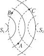 本题解析:从题图中可以知道,A点距波源S1、S2的距离均为1.5λ,即x1=1.5λ,x2=1.5λ,故A到S1、S2的距离差Δx=x1-x2=0,是两个波峰相遇,所以A为振动加强点,B点距S1距离x1=1.5λ,距S2距离x2=2λ,故B到S1、S2的距离差=λ,是波谷与波峰相遇,所以B为振动加强点,通过分析我们可得知,振动加强点离两波源的距离差满足:Δx=nλ(其中n=0,1,2,3,…).C点距S1距离x1=2λ,距S2的距离x2=1.5λ,故C到两波源S1、S2的距离差为Δx=x1-x2=0.5λ,是波峰与波谷相遇,所以C点是振动减弱点,同样可看出,振动减弱点离波源的距离满足:Δx=(2n+1)λ/2(其中n=0,1,2,3,…).