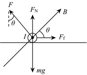 本题解析:涉及安培力时的物体的平衡问题,通过对通电棒的受力分析,根据共点力平衡方程求解。棒的受力分析图如图所示。