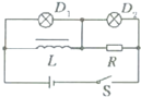 1、选择题 如图所示的电路中,D1和D2是两个相同的小灯泡,L是一个自感系数相当大的线圈,其阻值与R相同.在开关S接通和断开时,灯泡D1和D2亮、暗的顺序是( )