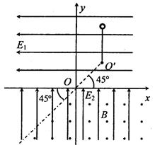 。在x轴下方的虚线(虚线与茗轴成45°角)右侧有垂直纸面向外的匀强磁场,磁感应强度为B。有一长为L的轻绳一端固定在第一象限内的O′点,且可绕O′点在竖直平面内转动;另一端拴有一质量为m的小球,小球带电量为+q。OO′与x轴成45°角,其长度也为L。先将小球放在O′点正上方,从绳恰好绷直处由静止释放,小球刚进人有磁场的区域时将绳子断开。