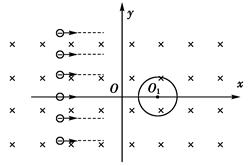 2、计算题 如图所示,xOy坐标系内有匀强磁场,磁感应强度为B,方向垂直纸面向里,x<0区域内有匀强电场(图中未画出),y轴为电场右边界.磁场中放置一半径为R的圆柱形圆筒,圆心O1的坐标为(2R,0),圆筒轴线与磁场平行,现有范围足够大的平行电子束以速度v0从很远处垂直于y轴沿x轴正方向做匀速直线运动射入磁场区,已知电子质量为m,电荷量为e,不考虑打到圆筒表面的电子对射入磁场的电子的影响.