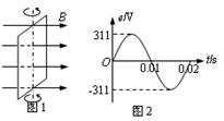 4、选择题 在匀强磁场中,一矩形金属线框绕与磁感线垂直的转轴匀速转动,如图1所示。产生的交变电动势的图象如图2所示,则: