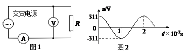 5、计算题 正弦交变电源与电阻R、交流电压表、交流电流表按照图1所示的方式连接,R=200Ω。图2是交变电源输出电压u随时间t变化的图象。则: