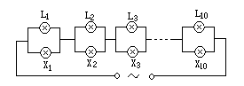 5、选择题 某设备有10个标有“24V、200W”相同的强光灯L1~L10,另有10个标有“220V、2W”相同的指示灯X1~X10,将其连接在220V恒压交流电源上,电路连接如图所示.若工作一段时间后,L2 灯丝烧断,则