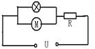 4、计算题  (10分) 小型直流电动机(其线圈内阻为r=1)与规格为“4V、4W”的小灯泡并联,再与阻值为R=5的电阻串联,然后接至U=12V的电压上,如图小灯泡恰好正常发光,电动机正常工作,求: