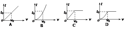 3、选择题 如图所示,水平面上固定有一个斜面,从斜面顶端向右平抛一只小球,当初速度为v0时,小球恰好落到斜面底端,小球的飞行时间为t0。现用不同的初速度v从该斜面顶端向右平抛这只小球,以下哪个图象能正确表示小球的飞行时间t随v变化的函数关系